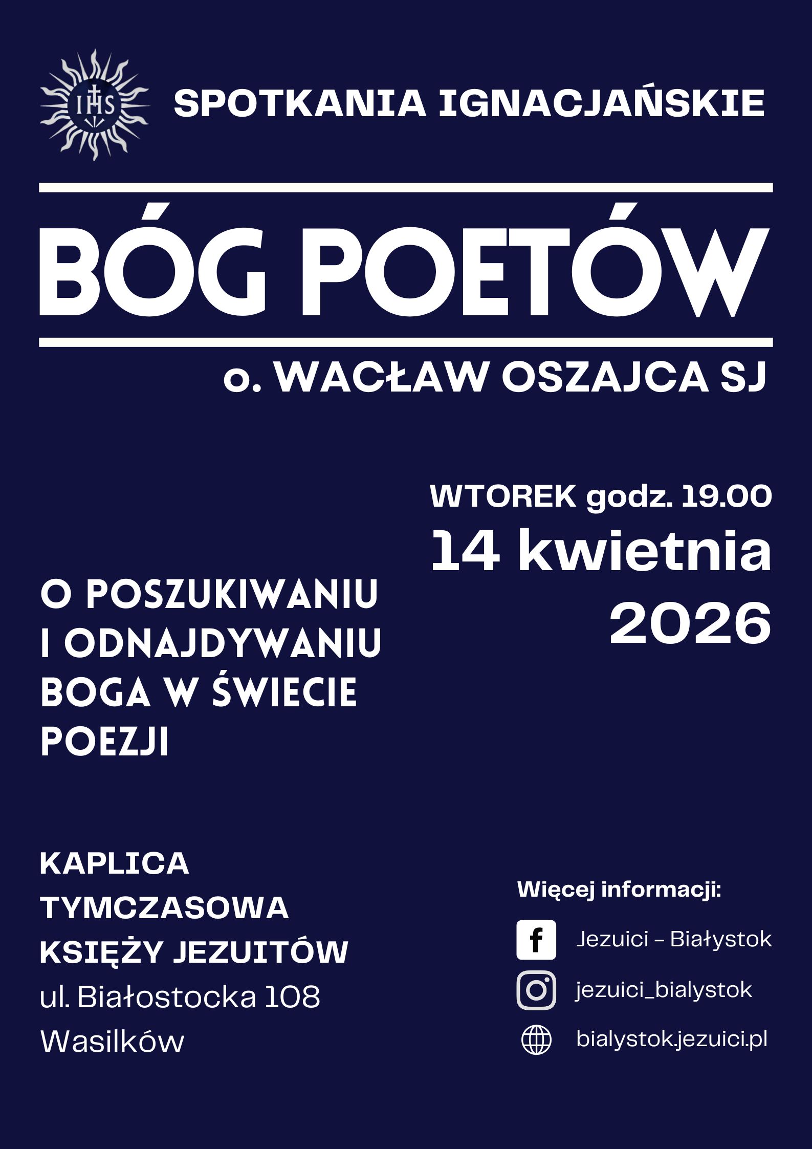 Wtorek 14 kwietnia 2026 r. godz. 19:00 w tymczasowej kaplicy oo. jezuitów w Wasilkowie ul. Białostocka 108.
